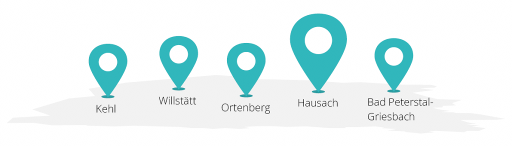 Im Umkreis dieser Standorte bieten wir unsere ambulanten Dienstleistungen an. Insgesamt decken wir somit den gesamten Ortenaukreis und das Rheintal ab.